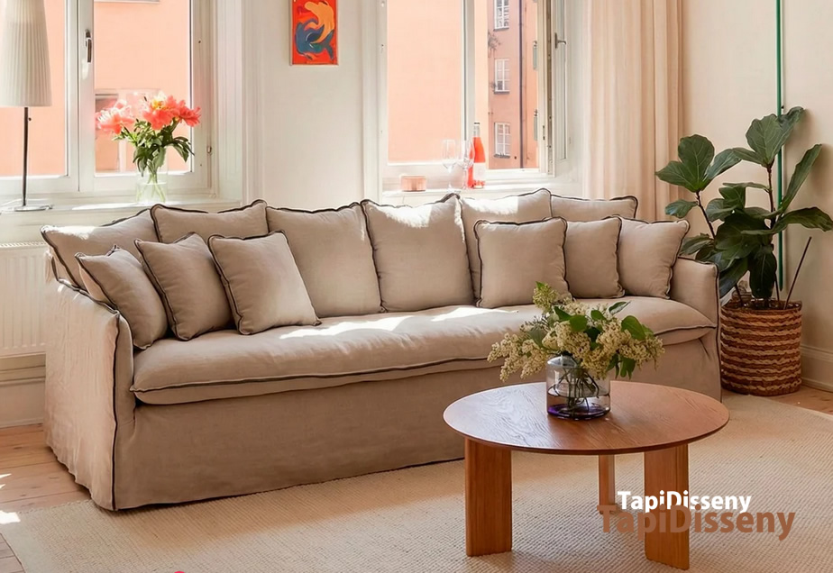 El faldón no es solo una decisión estética, también influye en cómo se percibe el sofá dentro del espacio. Suaviza las líneas, integra la pieza en el entorno y genera una sensación de continuidad visual que encaja especialmente bien en ambientes luminosos, naturales y tranquilos.